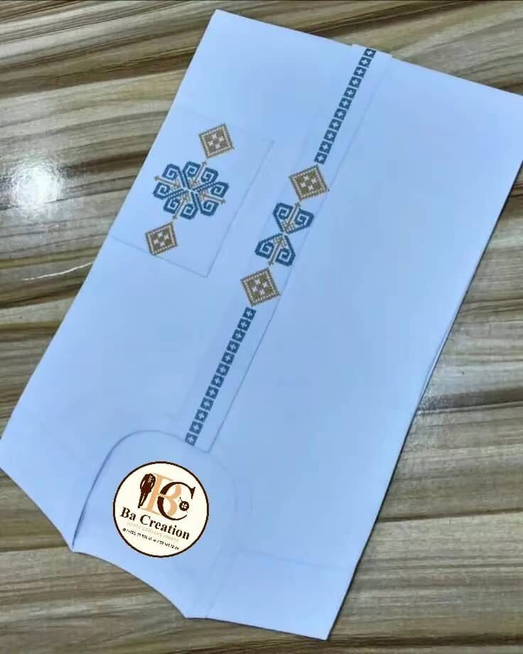 Deuxième modèle : Une costume africain blanche ornée de motifs géométriques en fil doré et bleu clair, alliant pureté et finesse. Ce modèle incarne la classe et la simplicité.