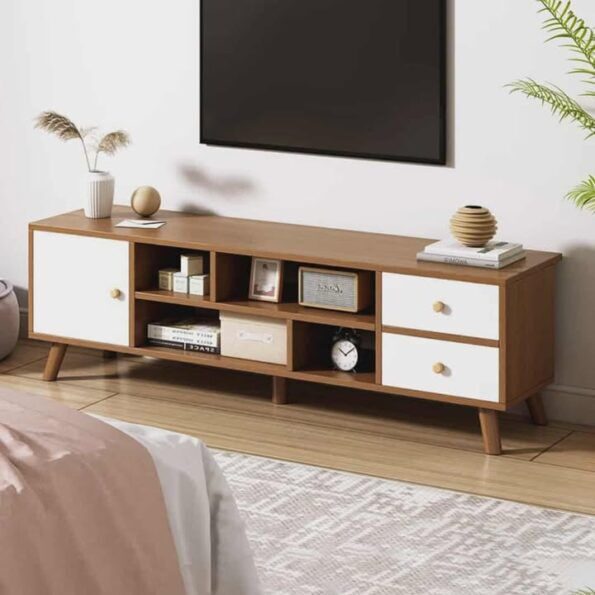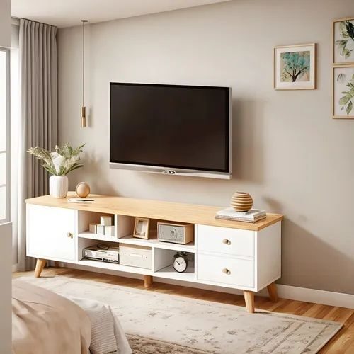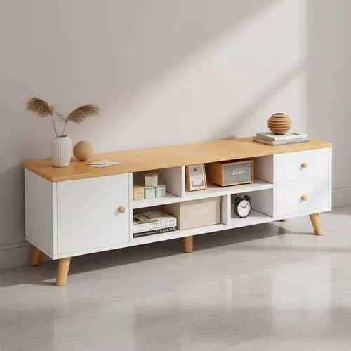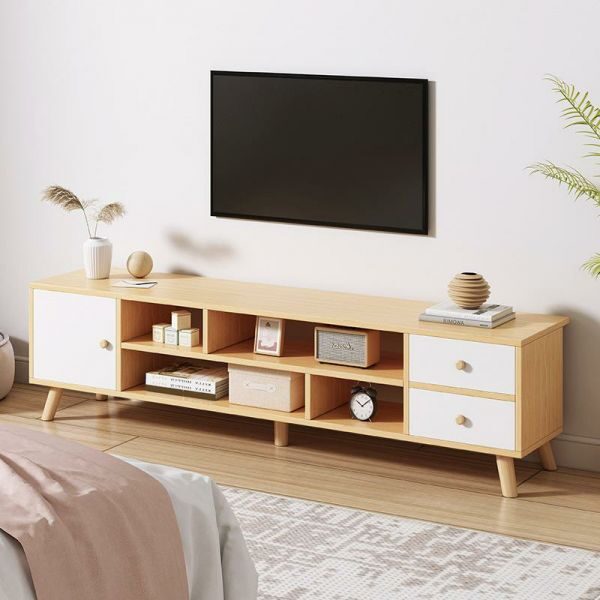 Meuble TV de salon minimaliste couleur naturelle.Meuble TV Moderne Simple Sur Pied meuble de Salon , chambre Style Rondin, meuble console avec tiroir de rangement et casier ouvert. Disponible en 3 couleurs